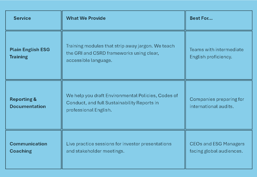 Our training programs are exclusively developed and delivered by native English speakers who hold advanced language teaching certifications and specialized expertise in global sustainability frameworks. This unique combination ensures that we do not just teach the technical requirements of ESG, but we do so using pedagogical methods specifically designed for non-native learners. By blending linguistic precision with deep environmental, social, and governance knowledge, our trainers help your team master the complex terminology of the GRI and CSRD in a way that is clear, accurate, and ready for the international stage.